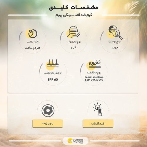 عصاره گیاه اسپیره کوهی موجود در این کرم، با خواص ضد التهابی و تسکینبخش خود، به بهبود و آرامش پوست کمک میکند. کرم ضد آفتاب رنگی پریم، به پوست شما ظاهری یکنواخت و طبیعی میبخشد و همزمان از آن در برابر آفتاب محافظت میکند. بافت سبک و رنگی آن، بدون ایجاد حس سنگینی، به راحتی جذب پوست میشود و تجربهای خوشایند از استفاده را به ارمغان میآورد. این محصول، انتخابی ایدهآل برای افرادی است که به دنبال یک ضد آفتاب کارآمد و موثر برای پوست چرب خود هستند.