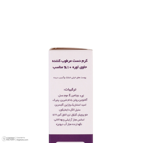 سایر توضیحاتاین کرم دست حاوی اوره، ویتامین E، موم عسل، آلانتوئین، روغن بادام شیرین و فاقد لانولین است.